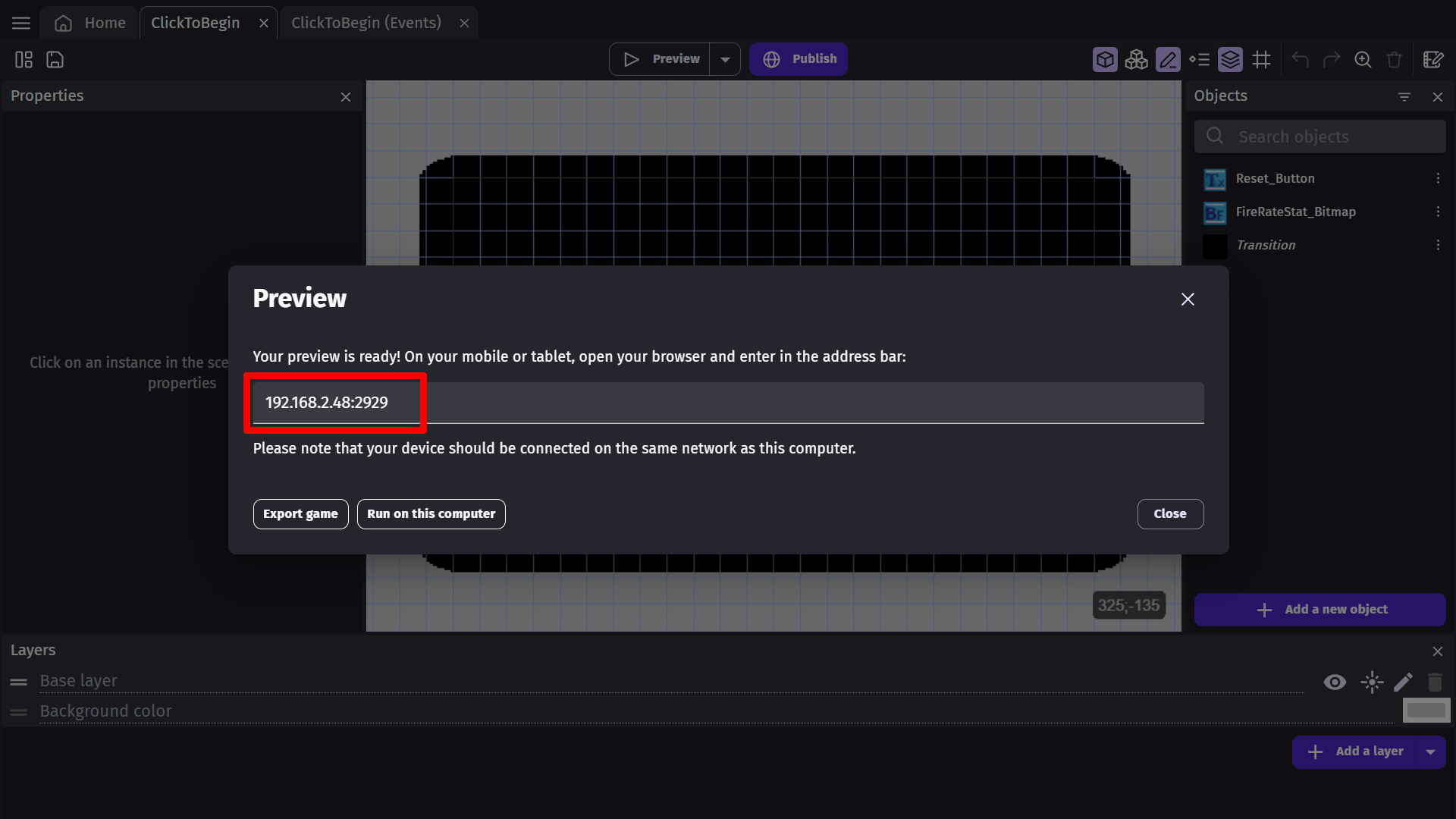You can now close the pop-up window in the editor and continue to edit your game. When you click on the button to apply the changes to the preview, all the previews running on your computer, other computers, or tablets/phones will be updated.